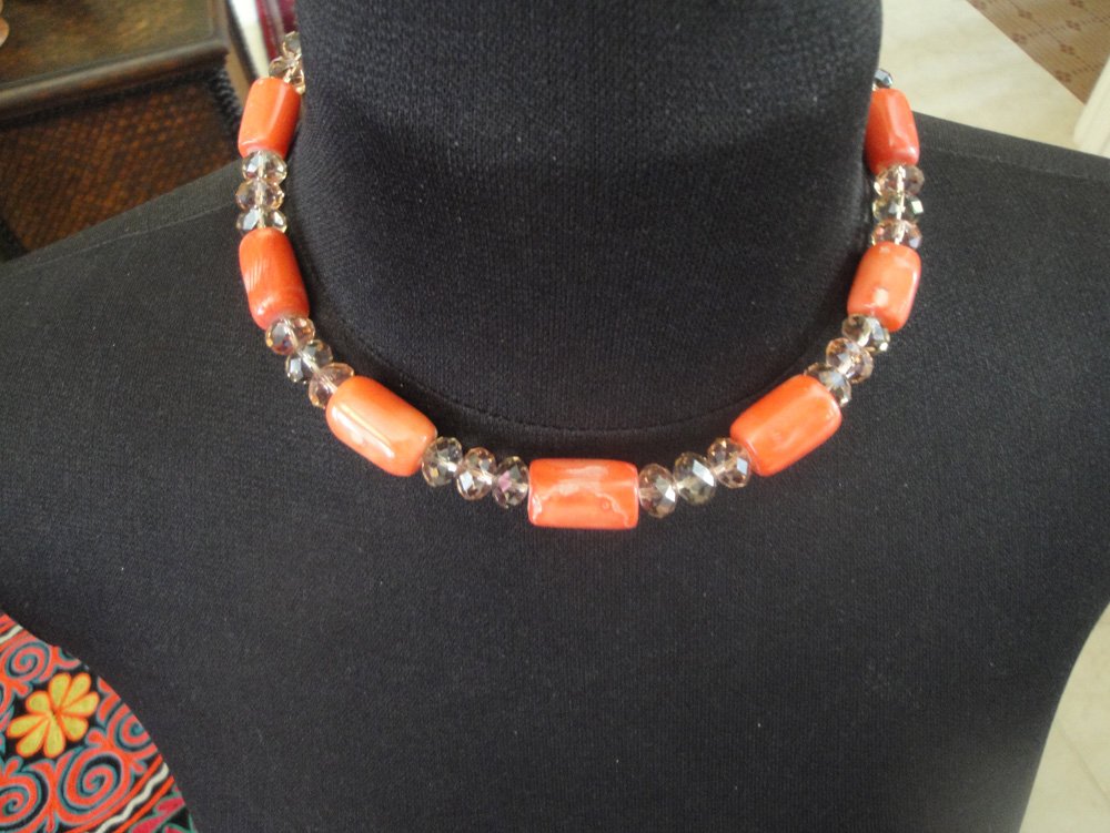 Coral Tubes (Orange) and 3 Crystal Links – Choker