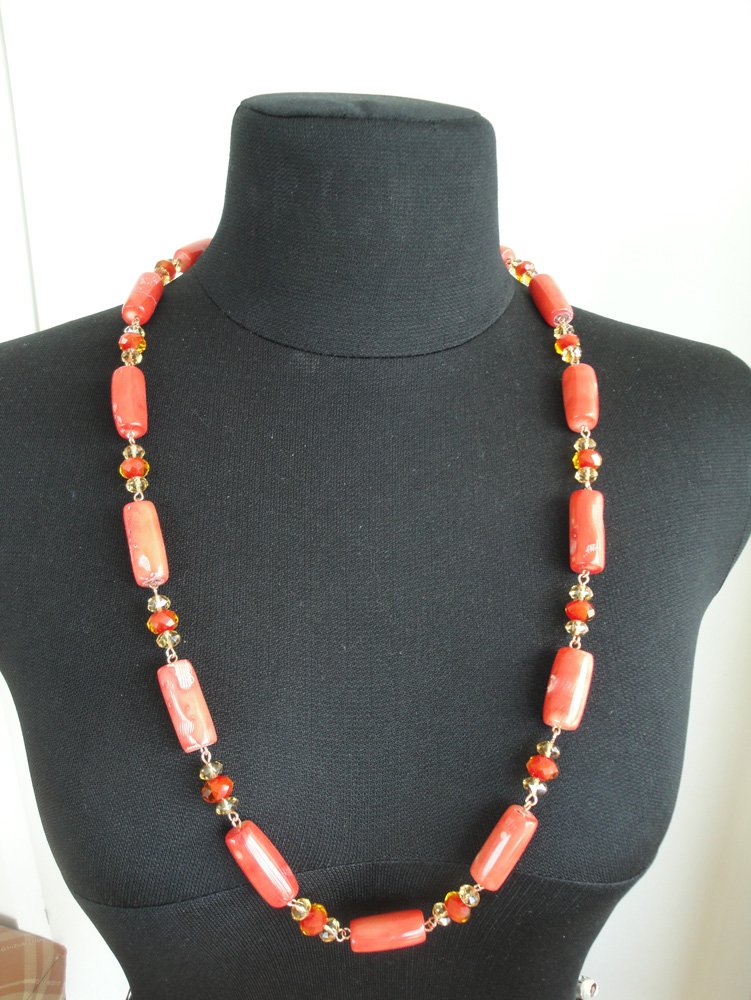 Coral Tubes & Crystal Link Necklace – Orange (Long)